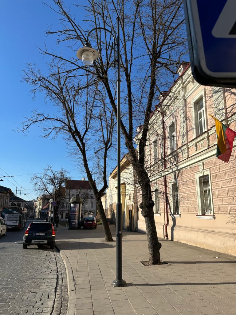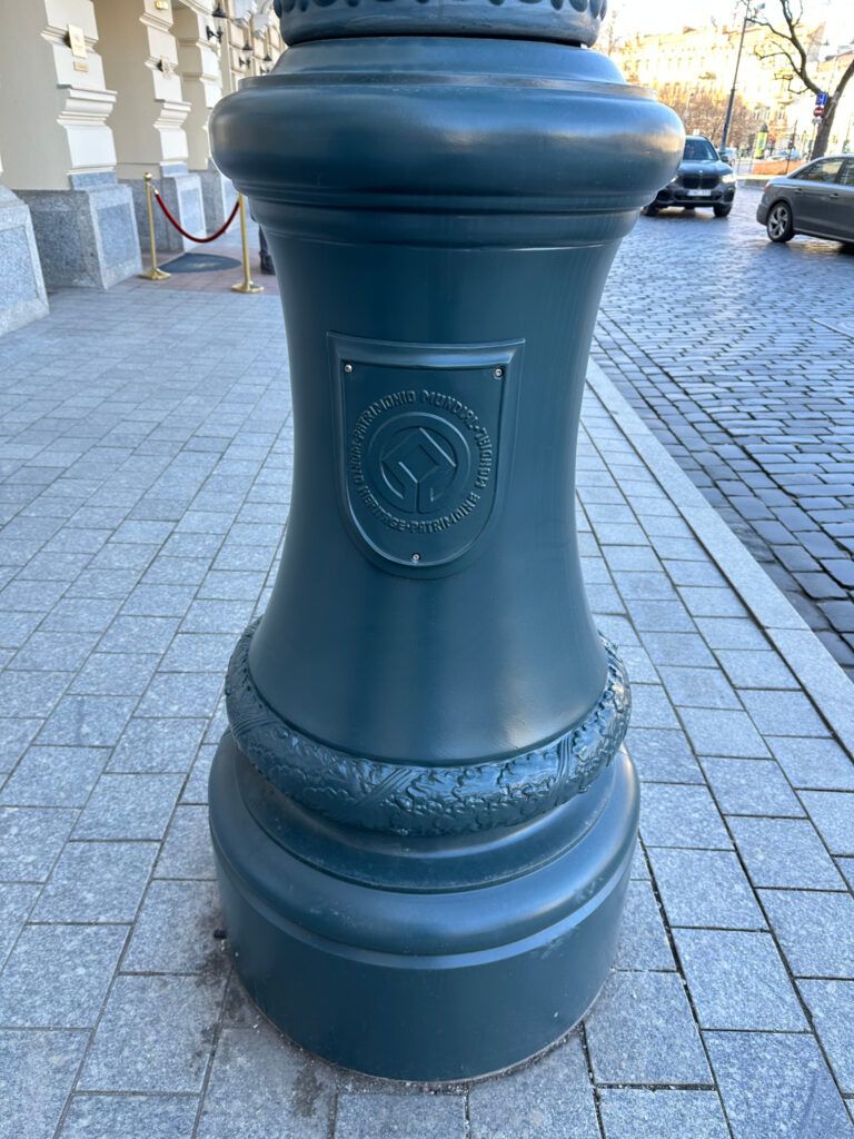 Luminaires suspendus G02 Mars sur la façade d'un bâtiment lituanien Grande lanterne de ville, dans les rues de Lituanie Lituanie, lampadaire, à côté d'un bâtiment public Lituanie, base du mât avec les armoiries